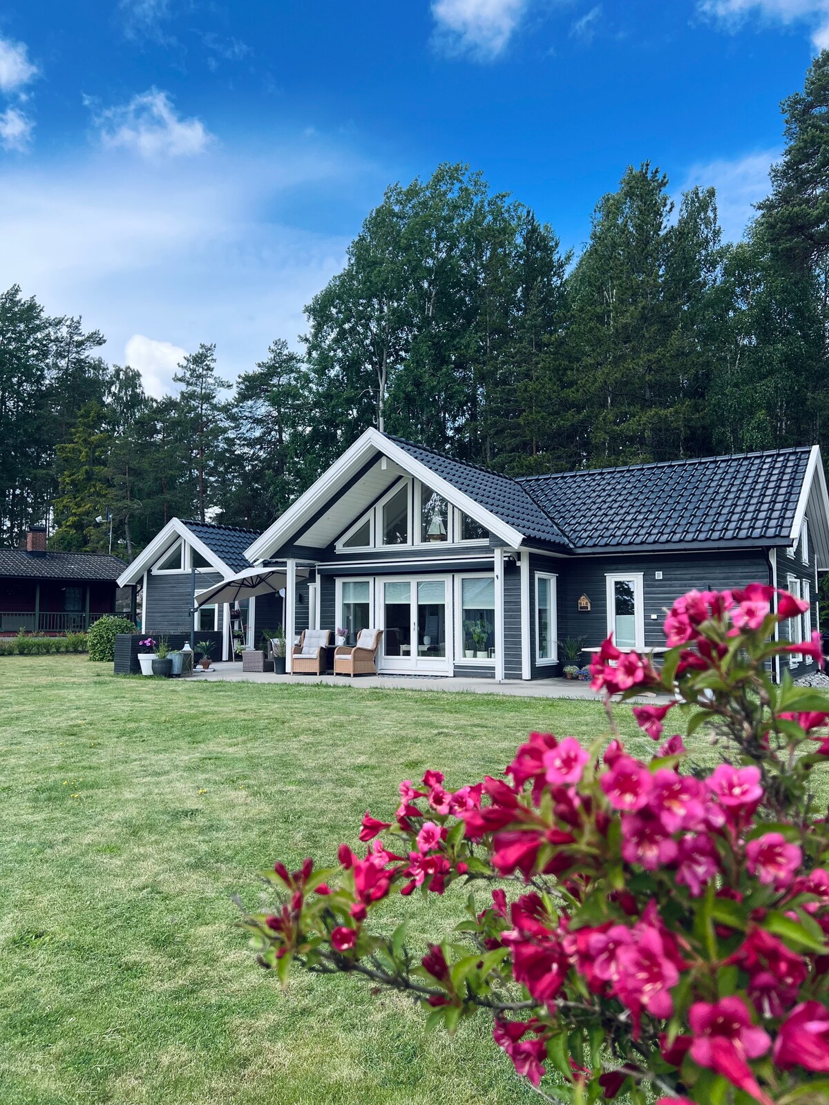 Bonita cabaña en una parcela grande, cálida y apta para niños con sol todo el día. La cabaña está sustancialmente renovada en los últimos años, con una cocina nueva, un baño más nuevo y dormitorios luminosos y acogedores. Hay tres dormitorios en la cabaña principal y un anexo con capacidad para cuatro personas, así como un aseo privado. La cabaña tiene un gran porche con varias zonas de estar. Por supuesto, es encantador estar aquí durante el verano, pero la cabaña está bien aislada, con leña además de una nueva bomba de calor. Así que también es una opción perfecta para otoño e invierno.