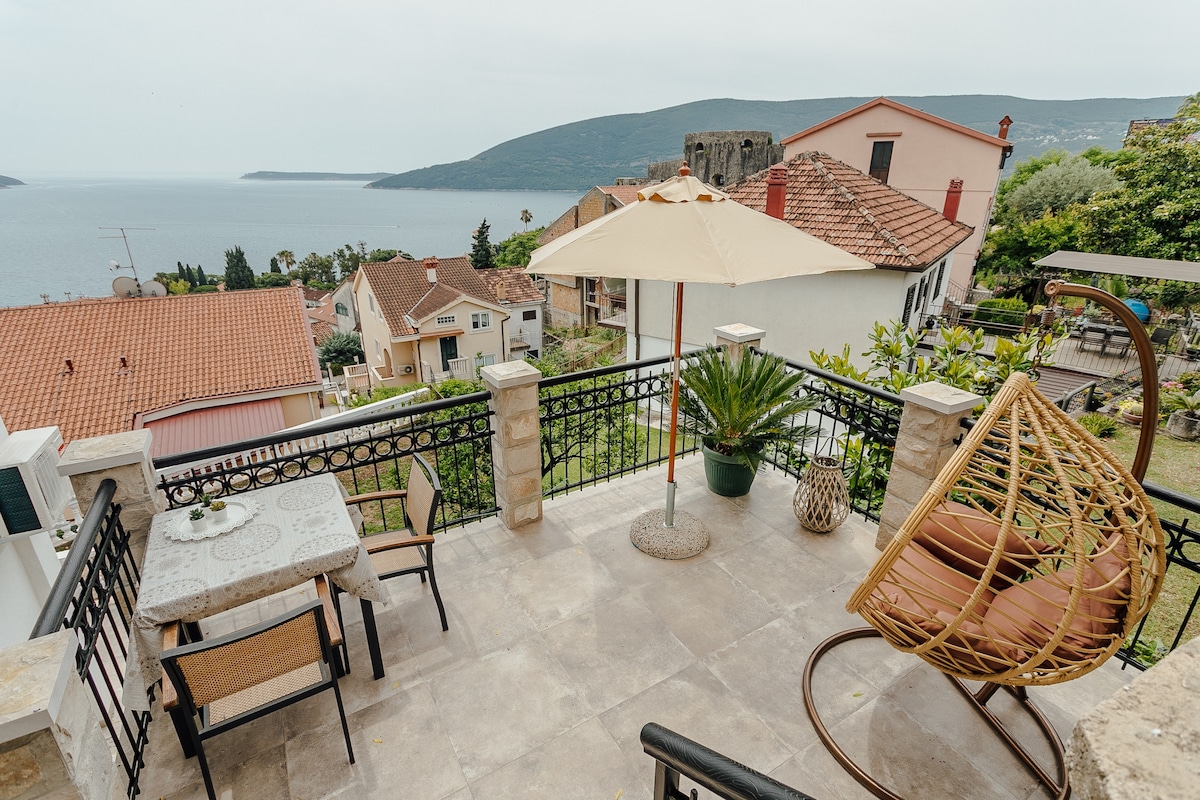 «Domek Molo Montenegro» Planta baja de una encantadora casa en la colina Podi en Herceg Novi, con vistas al mar y a la ciudad. El apartamento tiene dos dormitorios dobles con camas dobles, una sala de estar con cocina, un baño, una terraza y una plaza de aparcamiento. Estarás rodeado de lugareños y de su vida cotidiana. Nuestra casa de campo está en una colina, fuera de la ciudad, pero justo en una calle local, es posible que necesites un coche o taxi para llegar a la playa o al centro de la ciudad. Desde la cabaña se puede ir a senderos de montaña cercanos. Apto para personas LGBT