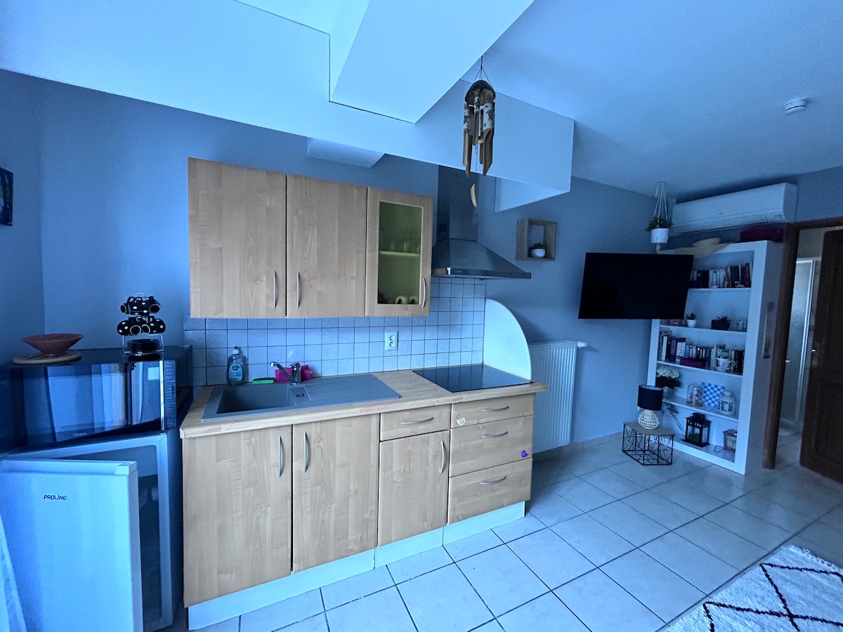 ¡Relájese en este tranquilo estudio independiente! El estudio dispone de cama de matrimonio, cuarto de baño con inodoro, lavabo, gran ducha y una pequeña cocina con nevera/congelador, microondas, fregadero y 2 placas de inducción. Terraza cubierta de 20 m2 con barbacoa, sillones y hamaca. Alojamiento 100 % independiente y llegada autónoma. A 10 minutos de Grenoble y a 20 minutos de Lans en Vercors. Situado en el límite del bosque con acceso directo al jardín.