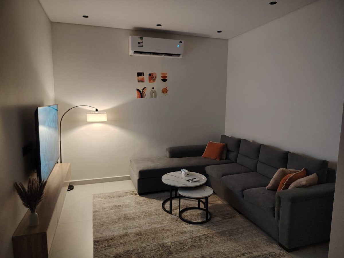 Este apartamento limpio y cómodo es ideal para parejas, viajeros solos o huéspedes de negocios que buscan una estancia limpia y tranquila. Diseñado para la comodidad, el alojamiento está equipado con un cómodo sofá Bella de Mutlaq Furniture, una red wifi de alta velocidad, una televisión inteligente y una cafetera Nespresso. Zonas a las que tiene acceso el viajero Acceso fácil al apartamento de arriba con cerradura digital. Otros aspectos que debes tener en cuenta Este es un edificio residencial y un barrio tranquilo. Ten en cuenta los niveles de ruido al llegar y salir. No se permiten eventos ni fiestas en absoluto.