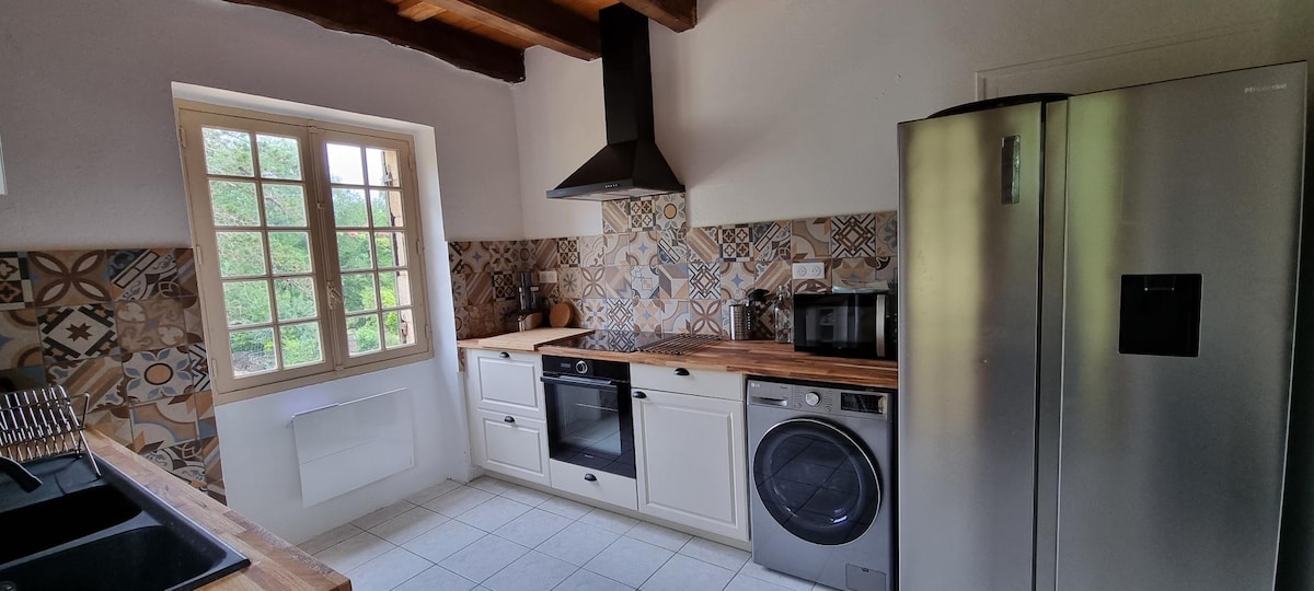 Casa rural con encanto en casa Périgourdine renovada de 79 m2, sala de estar de 40 m2 con cocina abierta totalmente equipada, sala de estar, sala de estar. Terraza de 40 m2 con vistas despejadas al valle. No hay vecinos , tranquilo en el campo, parcela no vallada con acceso privado y plaza de aparcamiento.