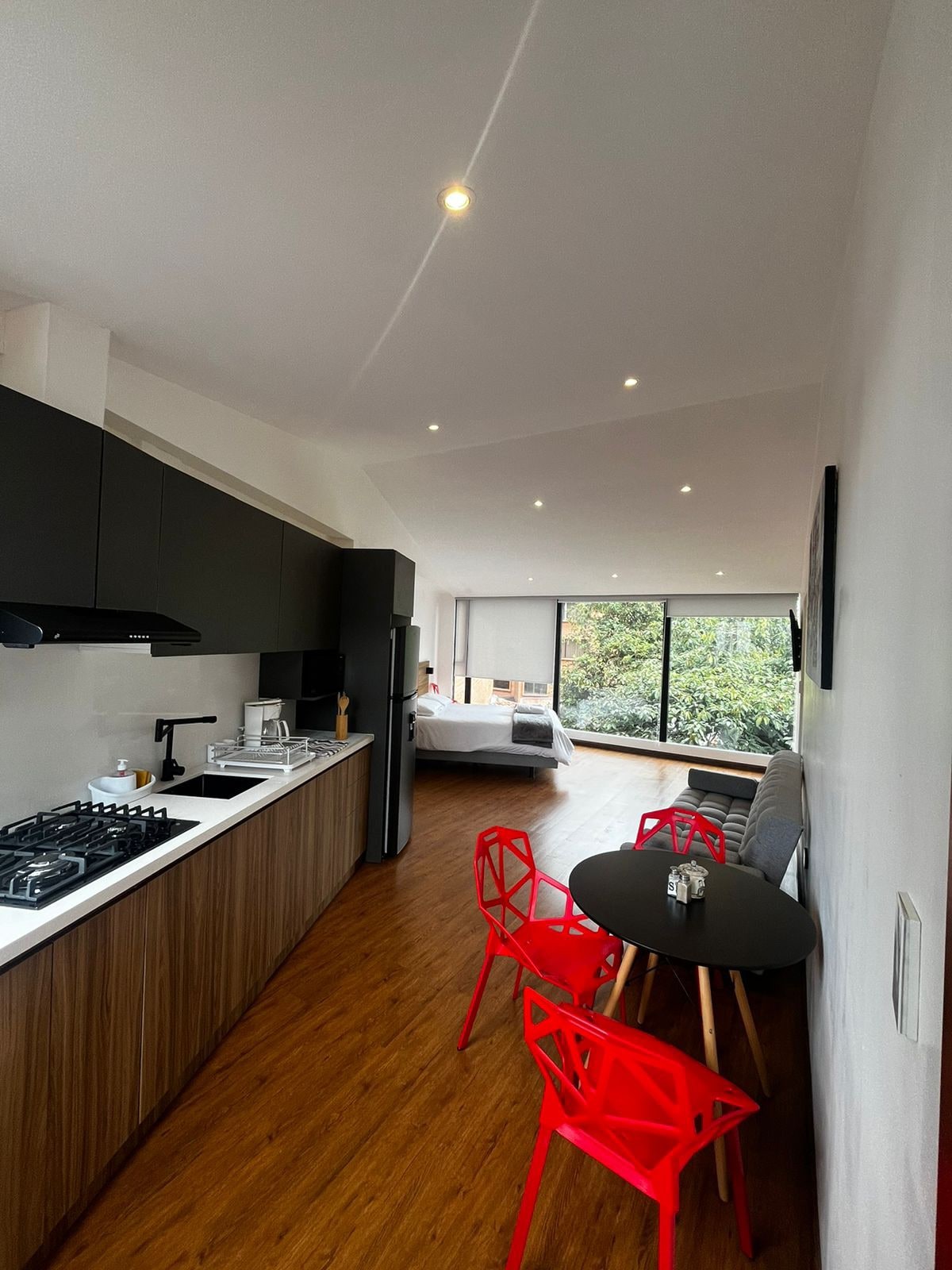 Disfruta de un espacio con sala, comedor, cocina, lavandería, un dormitorio y un baño completo. Además, incluye un práctico sofá cama para mayor comodidad. Dispondrás de parqueadero privado dentro de las instalaciones. Con una hermosa vista a la ciudad; a pocos minutos del centro histórico y cerca de restaurantes, tiendas y parques para que explores a gusto. La cocina está equipada con todo lo necesario y, por supuesto, contarás con conexión WiFi para mantenerte siempre en contacto.