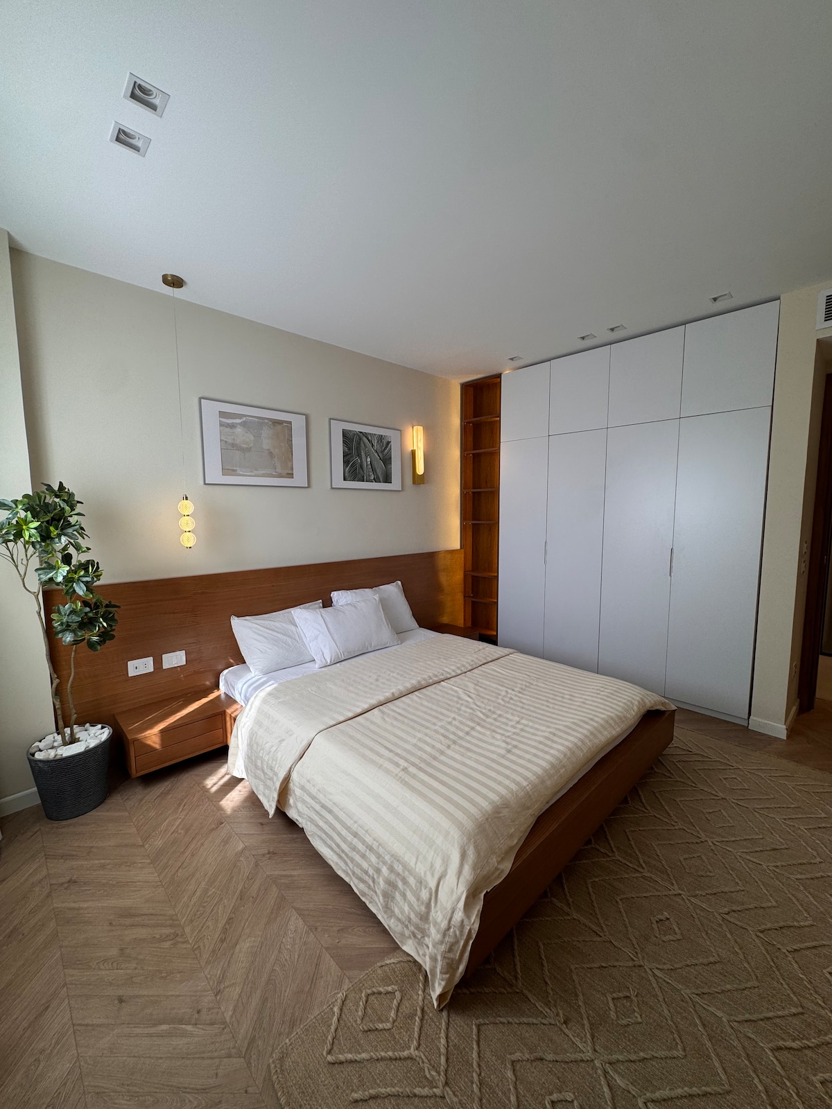 Our modern penthouse with a private pool is perfect for families seeking convenience and luxury. Located in a gated community in the upscale area of New Cairo, just 30 minutes from the airport, and close to amenities like KFC, Starbucks, and a variety of Western and local restaurants (Chili's, Fuddruckers, LongHorn Texas, Ibn Al Sham). Amenities like a King Bed, washer, dryer, dishwasher, and microwave ensure comfort, and 4 smart TVs provide entertainment.