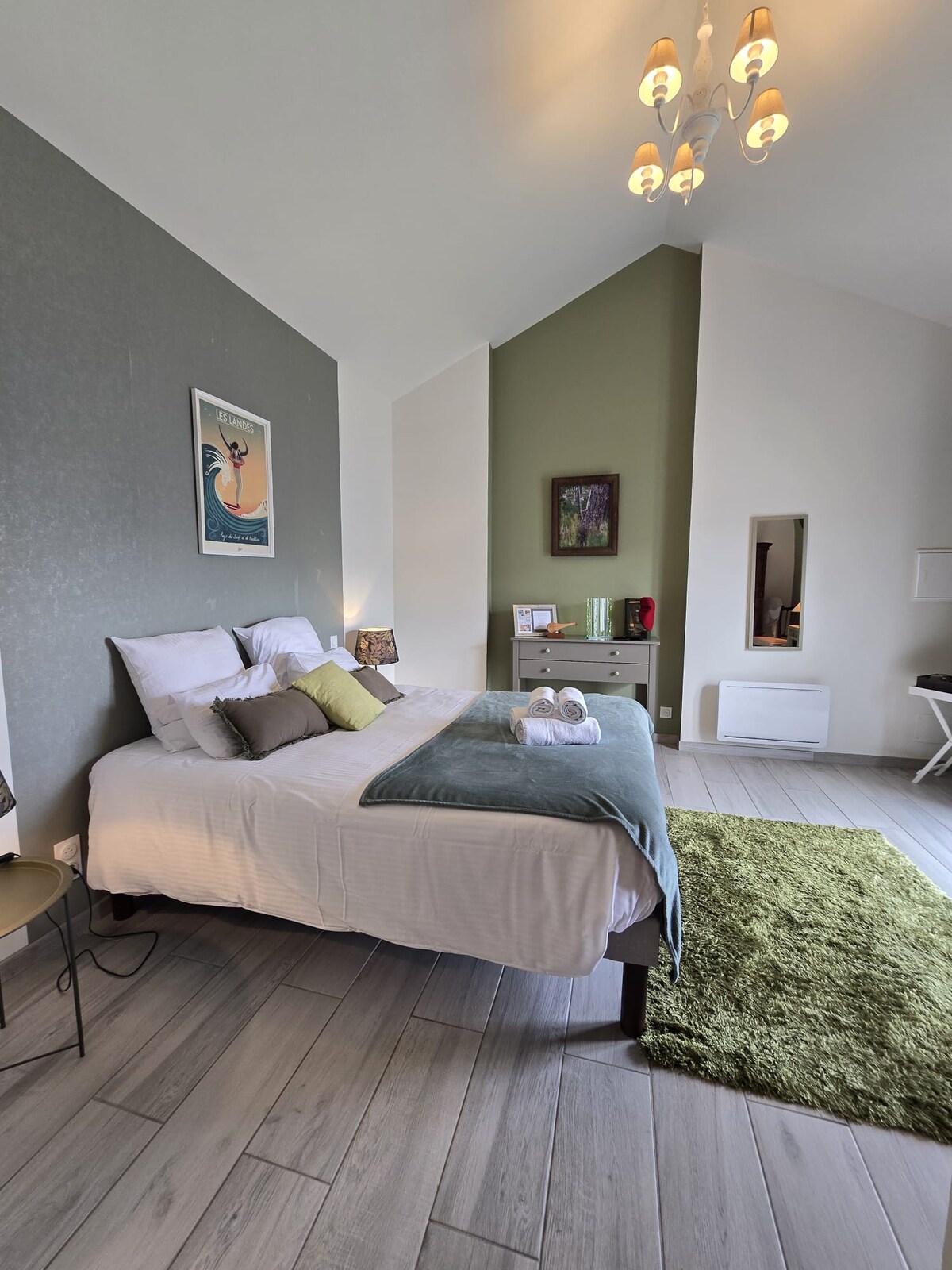 Habitación de huéspedes: suite principal para 4 personas abuhardillada de 27 m2 aire acondicionado móvil, desayuno incluido. 1 cama: 180 king size 1 cama: 140 1 cuna bajo petición. Cuarto de baño con ducha, inodoro + nevera + microondas + caja fuerte con código. ⚠️ atención no hay cocina. Esta suite Puede alojar a 2, 3 y 4 personas. A partir de la 3.ª persona: 20 € adicionales/persona. (bebé gratis hasta 2 años). 5 km estación de Bayona. 16 km aeropuerto de Biarritz.Espagne/30km A 400 metros la Vélodyssée a lo largo del Adour.