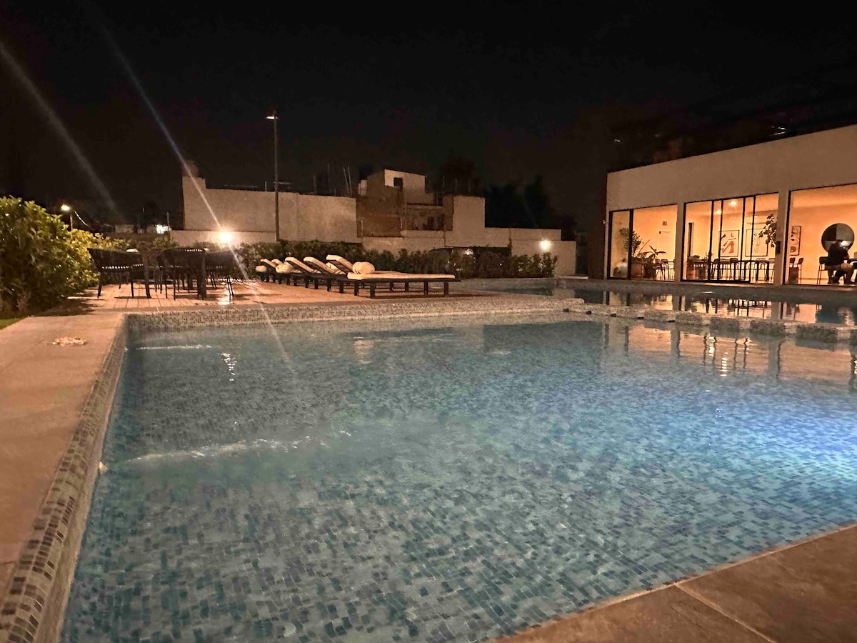 Relájate en este espacio tranquilo y elegante, ideal para pasar unos días de descanso. Con alberca privada climatizada ( 30 a 32 grados), relajante jardín, terraza abierta, cocineta y asador esta completamente equipada. Cuenta con 2 recamaras con un excelente diseño y preparadas para que disfrutes de un descanso placentero, con cama King en la principal y Queen en la segunda recamara ✔ Minisplit en ambas recamaras. ✔ Mini enfriador en recamara principal ✔ Internet en toda la casa de 500 Megas