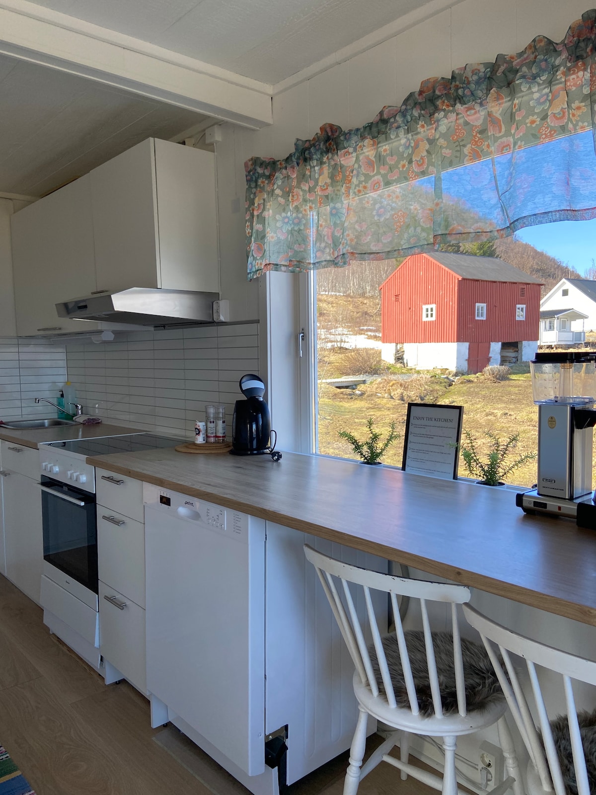 Disfruta del sol de medianoche o de la aurora boreal. Por encima de todo, queremos que tengas una muy buena estancia. Por eso te ofrecemos alquiler gratuito de bicicletas, raquetas de nieve, canoas, leña, barbacoas y kayak para aquellos con experiencia. El apartamento está en la primera planta y tiene grandes ventanales. Está en la naturaleza rodeado por el océano, playas de coral blanco, islotes y arrecifes, puedes verlo a través de las ventanas del apartamento. Aparca justo afuera y dentro realmente tienes todo lo que puedas necesitar.
