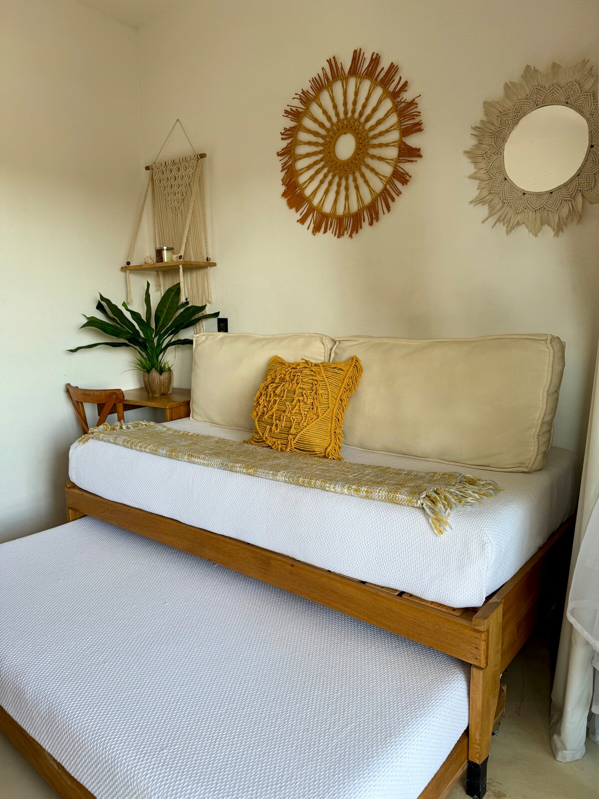 Hotel Casa Pachamama, habitación SOL, te brinda la calidez y el espacio que tu familia necesita para vivir una estancia inolvidable. Ideal para familias pequeñas. Cuenta con: •Una habitación privada, con cama matrimonial •Sala con sofá cama (2 camas individuales) •Un baño completo •Cocineta completamente equipada y comedor pequeño. Todas las comodidades (aire acondicionado, ventiladores de techo, wifi, TV, agua caliente. *El área de alberca y jardín son compartidas con otros huéspedes.