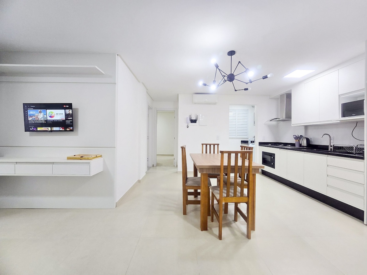 Apartamento nuevo, con piscina colectiva y ascensor, ubicación privilegiada, cerca de supermercados, restaurantes y comercios. Con una suite doble, 1 dormitorio con 2 camas individuales y 2 colchones adicionales, ambos con aire acondicionado dividido, sala de estar, TV inteligente y wifi en el comedor, balcón con barbacoa, cocina con nevera dúplex, microondas, cafetera eléctrica, sandwichera, licuadora y otros utensilios, área de servicio con lavadora y aparcamiento para un coche.