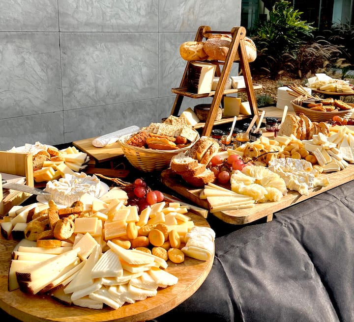 Selección de quesos internacionales: Camembert, Tête de Moine, Roquefort y otras variedades exclusivas. Incluye frutas y nueces.