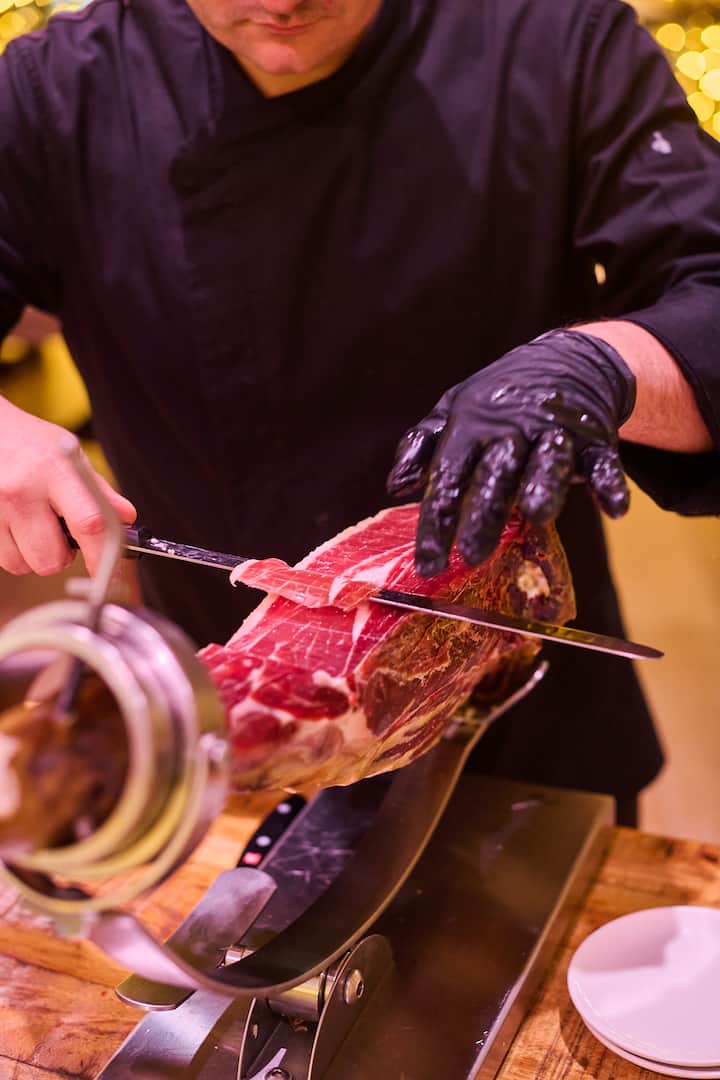 Servicio de corte de jamón ibérico de alta calidad. Cada corte realza el sabor y la textura del producto.
