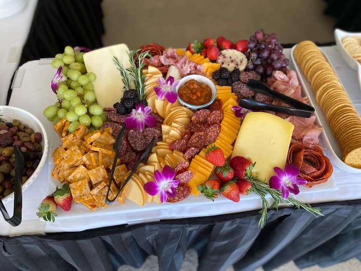 Eleva tu fiesta con deliciosos aperitivos, tablas de embutidos y exhibiciones de comida que sorprenderán a tus invitados.