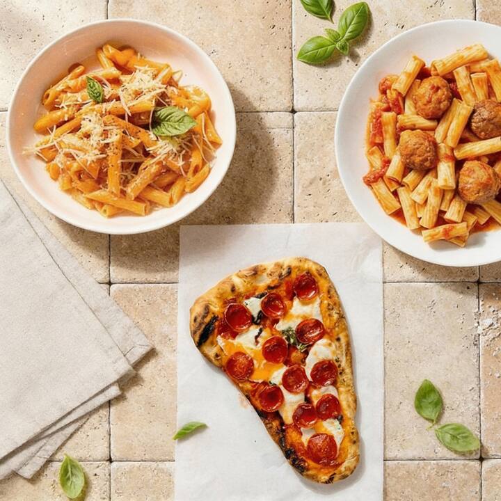 Entregado fresco a domicilio entre las 8:00 y las 20:00. Satisface todos tus antojos con la pizza naan de pepperoni de John DeLucie (queso fresco y miel con infusión de pimienta caliente), el rigatoni de los domingos de mamá (salsa tradicional de los domingos con albóndigas saladas, auténtica marinara y salchicha de cerdo italiana picante) y penne con salsa rosa picante (una mezcla de marinara roja y salsa alfredo blanca, pimienta roja triturada, queso Grana Padano y albahaca fresca). Incluye 1 de cada comida.
