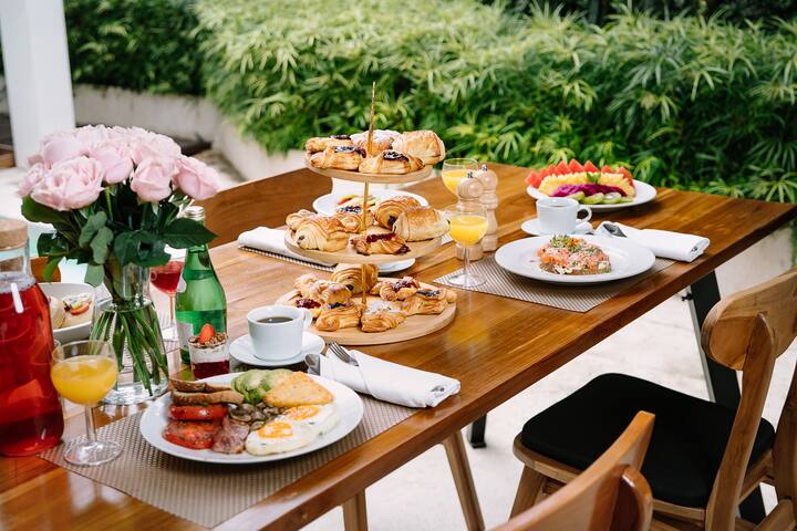 Comienza la mañana con un desayuno flotante único en la villa. La bandeja está bellamente dispuesta en la piscina, con platos recién preparados, frutas tropicales, pasteles y tu elección de café o té. Cada bandeja está diseñada para 2 personas, perfecta para pasar una mañana relajante juntos.