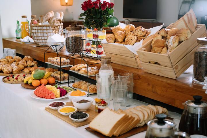 Comienza la mañana con un delicioso desayuno con dónuts, croffles, pasteles variados, una selección de panes recién horneados, frutas frescas en rodajas, yogur natural, mantequilla, una variedad de mermeladas, turrón, zumos frescos, café, té y cereales.
