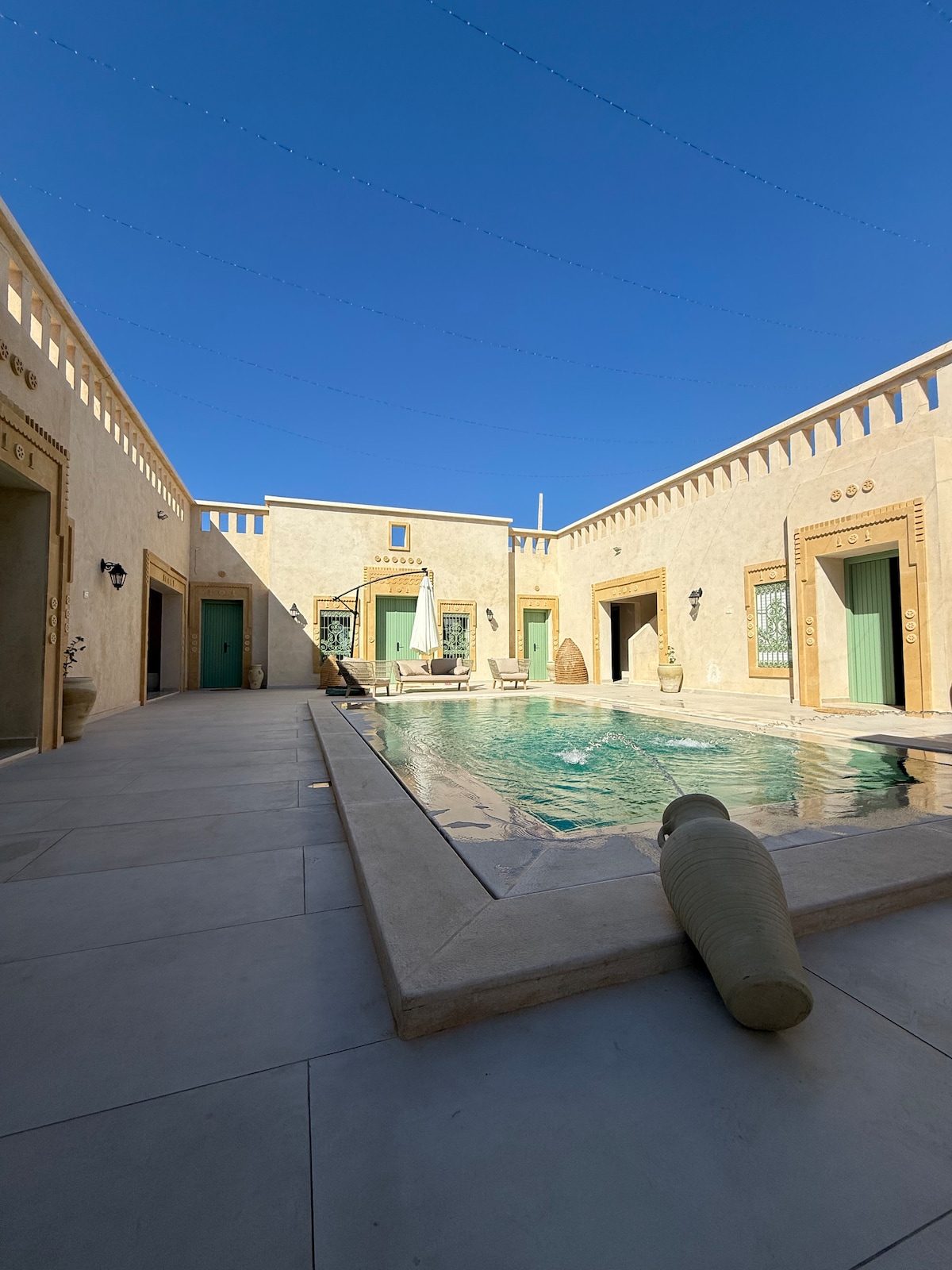 «Beit El Ezz La Grande» es una casa auténtica con una gran historia. Se ha renovado recientemente para darte la bienvenida en un entorno cálido y frente al mar. Consta de 3 master suites con sistema de aire acondicionado. Cuenta con 2 salones, una cocina, 2 baños y un techo panorámico con una vista impresionante de la bahía de Ouled Yaneg.