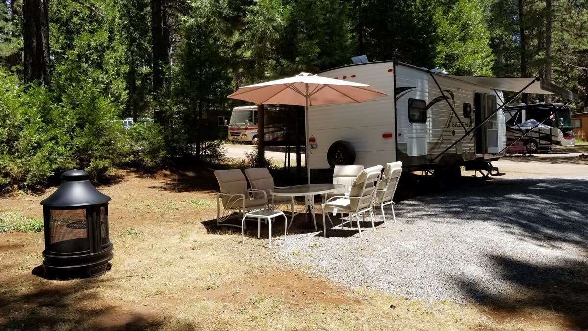 Esta autocaravana glamping se encuentra en el bosque con majestuosos pinos en Living Springs Resort, cerca del Parque Nacional Volcánico de Lassen. Es como acampar, pero tienes camas cómodas, cocina pequeña, baño privado, electricidad, aire acondicionado, calefacción, etc. ¡Acampada de lujo en todo su esplendor! Tenemos un pequeño lago, también conocido como estanque de pesca y un hermoso arroyo.