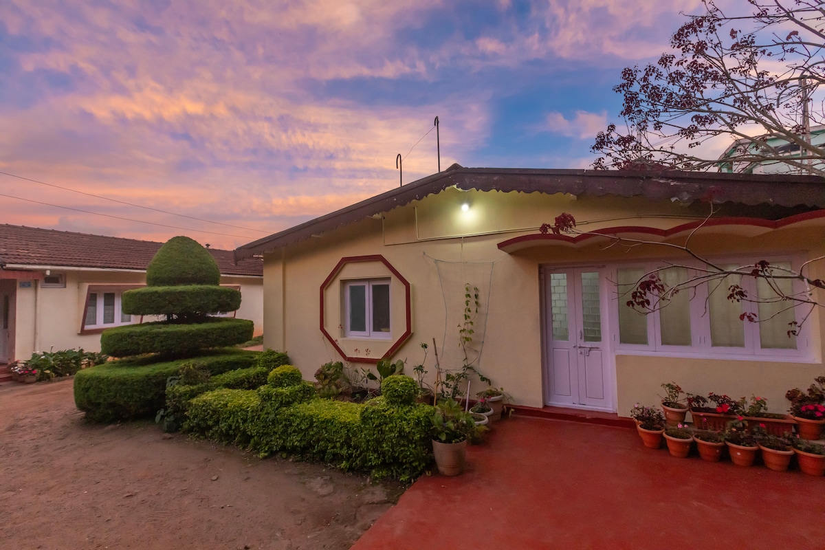 Una encantadora casa de campo situada dentro de una propiedad privada lo suficientemente grande para 4 adultos y algunos niños. A 2 minutos a pie del famoso Sims Park, a 5 minutos del Coonoor Club, a 15 minutos del club y campo de golf Gymkhana y a un máximo de 15 minutos de varios restaurantes. Desayuno de cortesía. Cuidador en las instalaciones 24/7 para obtener ayuda SE admiten mascotas. Amplio estacionamiento seguro para autos. El espacio alrededor de la cabaña se puede utilizar para sentarse y disfrutar de una taza de té o una hoguera. Ayuda a organizar los viajes de visita.
