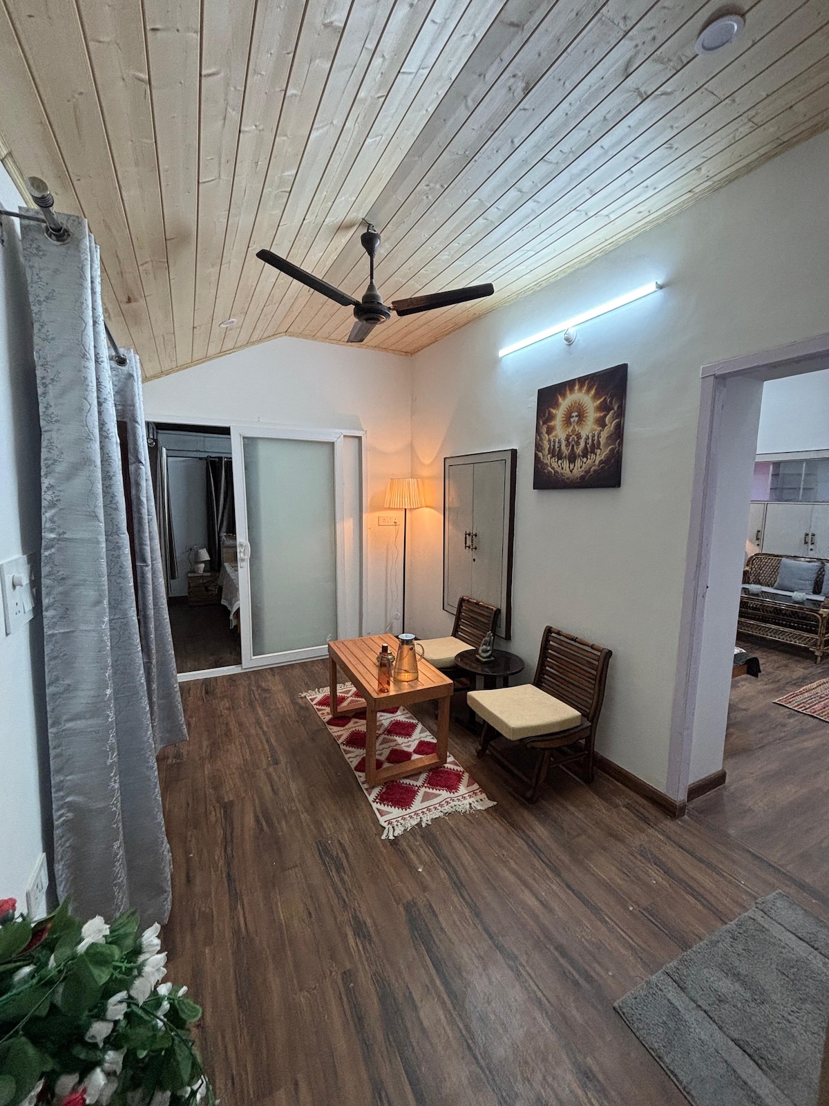 Nestled amidst trees, yet centrally located in the heart of Dharamshala, this ground floor apartment offers a long garden, where sounds of birds chirping add to distant views of the Dhauladhars. With a huge garden and open space, it makes for an ideal getaway in the hills of Dharamshala. On street parking right outside, a short slate pathway guarded by tall bamboo, brings you to this idyllic home, ideal for families and couples.