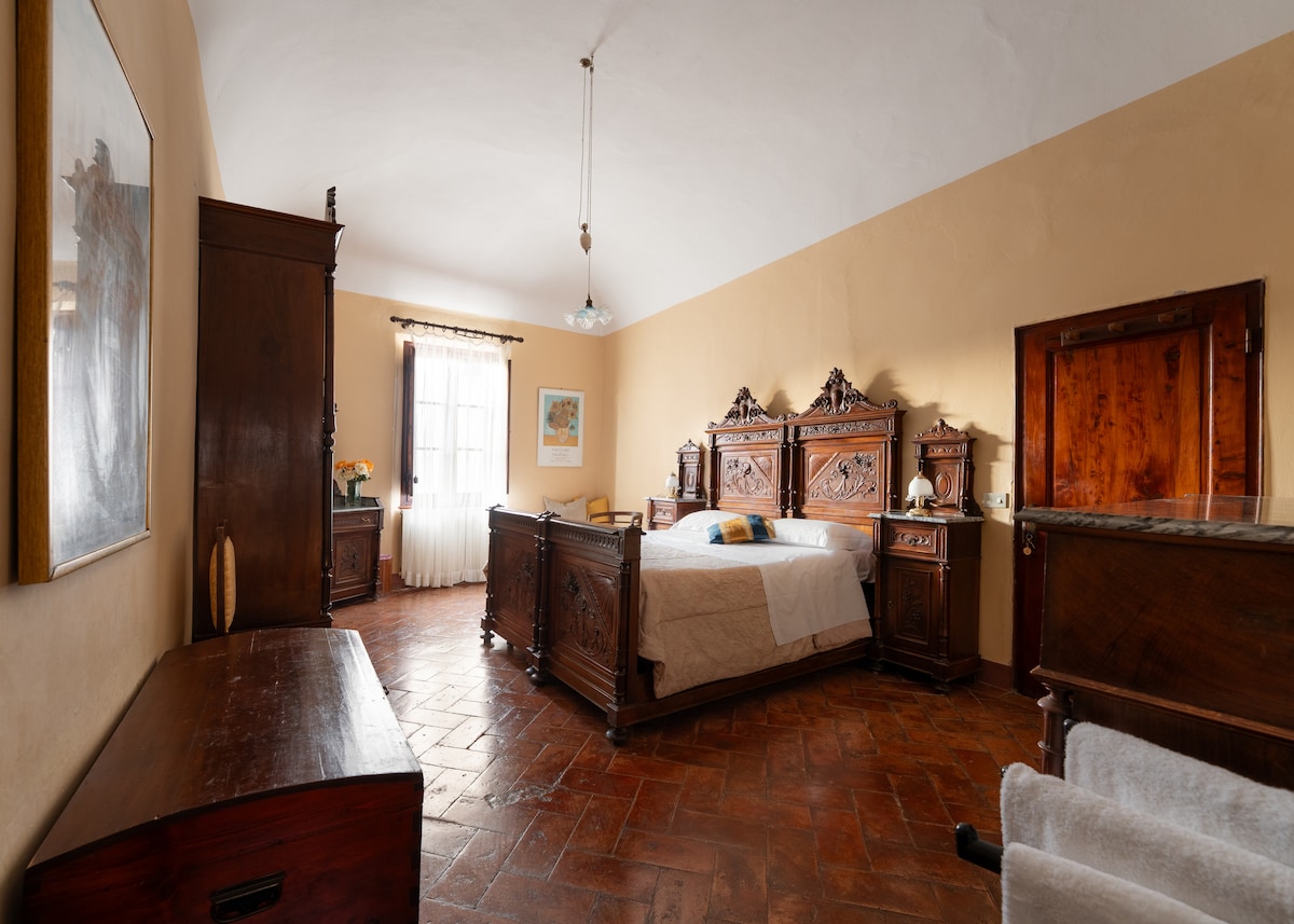 Amplia habitación de 29 metros cuadrados con desayuno buffet incluido y baño privado con ducha, que consta de una cama doble y dos camas individuales, adecuada para familias o grupos de amigos que buscan un alojamiento cómodo. Esta solución se encuentra en la segunda planta de la estructura con una espléndida vista de la montaña y el Castillo Medieval, está amueblada en estilo artístico toscano tradicional y caracterizada por suelos de terracota florentina, techos con vigas y vigas, cabeceros de cama de hierro forjado