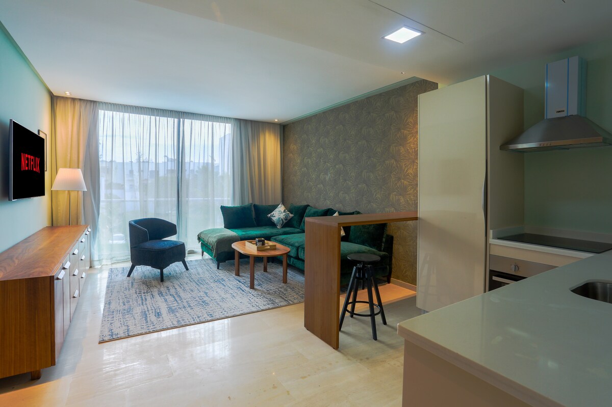 HM06 – Opale Sea Side: suite de arquitecto de 1 dormitorio, terraza con vistas al mar y acceso directo a la playa de Aïn Diab (5 minutos a pie). Residencia de alto standing con piscina exterior y aparcamiento gratuito. Tranvía «Aïn Diab – Centre» a 600 m, Anfa Place Mall a 1,8 km, Morocco Mall a 3,7 km. Check-in autónomo, wifi de fibra: viva la Casablanca costera sin compromisos.
