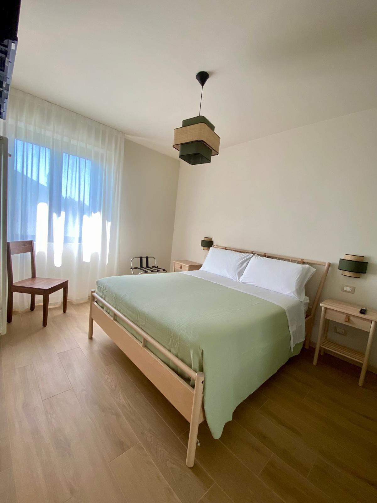 Appartamento di taglio medio piccolo collocato al piano primo. La zona giorno è caratterizzata da un piccolo angolo cottura, un tavolo con sedie quale zona pranzo ed un soggiorno con divano letto, Smart TV ed accesso al balcone arredato con sedie e tavolo. La zona notte invece è composta da una camera matrimoniale separata dal bagno tramite un piccolo disimpegno. L’appartamento è provvisto di riscaldamento e climatizzatore sia nella zona giorno che in quella da notte.