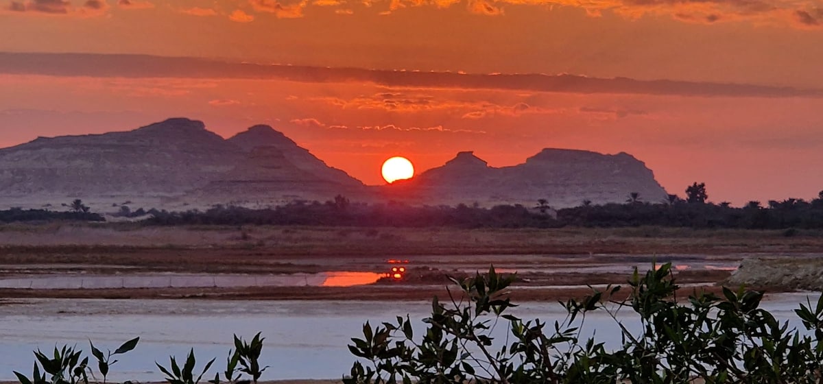 Forget your worries in this spacious and serene space. The house of the rising sun is a unique and peaceful place located in the Siwa owasis desert facing a big salt lake. The place is spacious with indoor and outdoor spaciois area, with all the privacy and tranquility you can with for. Surrounded by nature, big lake and magical oasis desert. Suitable for a family or a group of 5. 30 min drive to the center of Siwa town, we can provide a free ride to town once a day.