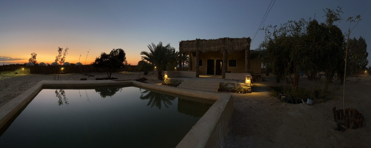 ¿Buscas un retiro tranquilo en Siwa? Te damos la bienvenida a tu joya oculta del desierto enclavada entre palmeras. Los cálidos días del desierto y las noches frescas están perfectamente equilibrados aquí con una piscina diseñada a medida en forma de Siwan para caídas diurnas y una acogedora fogata para las noches. Puedes disfrutar de contemplar las estrellas y disfrutar de una vista del bosque de palmeras de dátiles desde nuestra espaciosa terraza en la azotea. Para una experiencia culinaria única, nuestro chef de la casa puede preparar y entregar deliciosa comida Siwan directamente en tu puerta. ¡Disfruta de la naturaleza y relájate con nosotros!