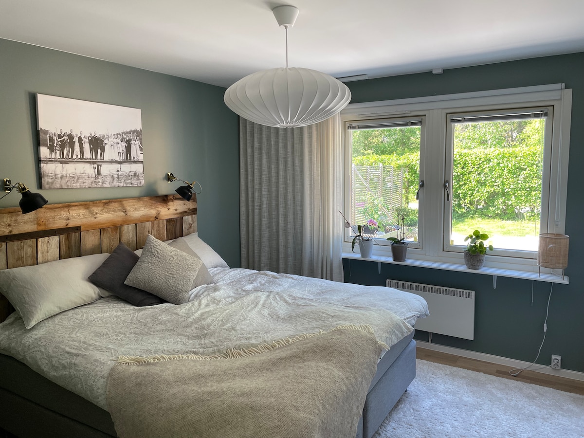 Aquí vivirás en un apartamento en la planta baja de una villa con entrada privada (check-in privado) Ubicación céntrica, a unos 20 minutos de Estocolmo o Arlanda en tren. Alojamiento El apartamento tiene 70 m2. Hay un salón, una pequeña cocina, un dormitorio con TV y lugar de trabajo, un gran baño con ducha y sauna que se puede utilizar por un coste adicional de 10 € (120 SEK) por ocasión y garaje con gimnasio. Se pueden alquilar bicicletas. Hay té, café y leche. Aparcamiento gratuito, ropa de cama y toallas incluidas