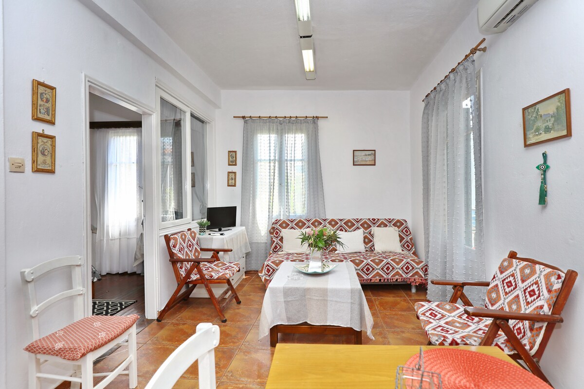 Este lugar especial está cerca de todo, por lo que es fácil planificar tu visita. El apartamento es muy espacioso y puede alojar cómodamente a 4 personas. Tiene 2 recamaras que tienen cama matrimonial. En el parte frontal del apartamento hay una gran cocina y la sala de estar equipada con mesa de comedor, sofá de esquina, chimenea, televisión y la vista de Skopelos.