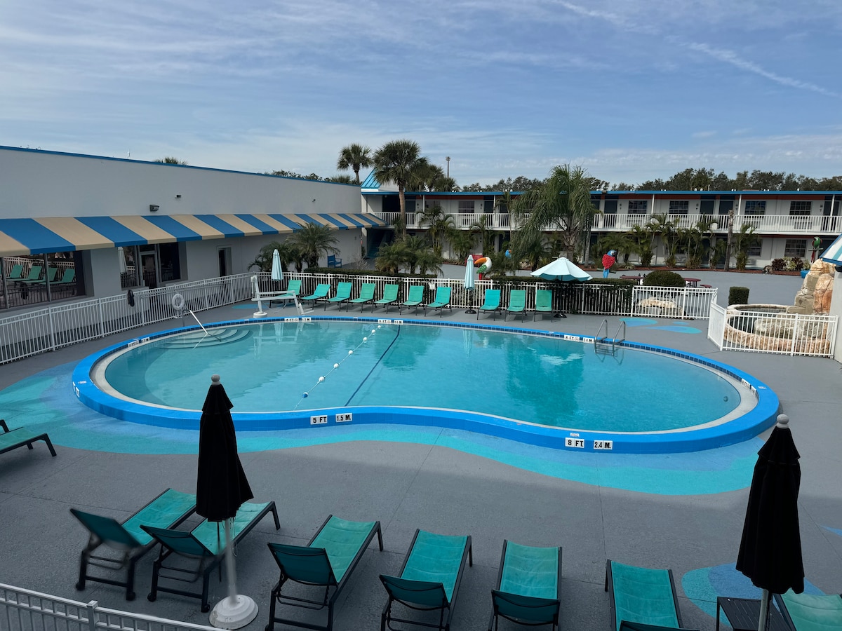 Swanky Studio ofrece una ubicación privilegiada cerca de las principales atracciones como Universal Studios, Disney World, International Drive, SeaWorld y el Centro de Convenciones del Condado de Orange. Los huéspedes pueden relajarse después de un largo día en los parques temáticos cercanos relajándose en la piscina o disfrutando de una bebida en The Cabana Bar & Grill, proporcionando comodidad y relajación en una ubicación céntrica. Es el lugar perfecto para cualquier persona que quiera experimentar todo lo que ofrece Orlando.