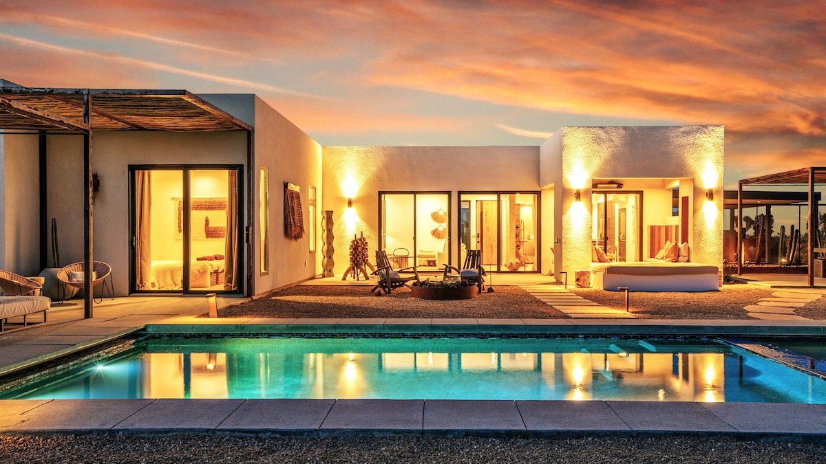 Casa con piscina bajo el sol de medianoche Joshua Tree