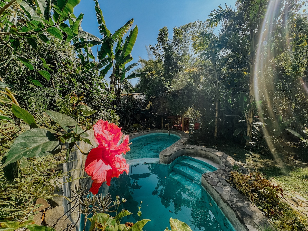Cozy cottage with wood ceilings, located in a private area near vegetable farm . With 2 bedrooms (Main with 1 Queen bed, secondary with 2 Full beds), open kitchen & dining area fit for 6 people, living room with sofa bed & fireplace, 1 bathroom with solar heater, and outdoor fireplace & gas grill. Great for bird watching & relaxing in our luscious gardens, our quiet patch in paradise is great for getting away from the hectic and noisy city and finding oneself, all within 5 minutes from "Pana".