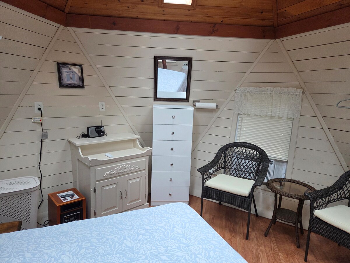 Las cabañas de Barker Pond Farm, construidas en 2010, cuentan con comodidades modernas que incluyen un baño completo y cocina, equipadas con toallas, ropa de cama y utensilios de cocina. Cada cabaña tiene capacidad para 4 personas, con un dormitorio tamaño queen y un loft con 2 camas individuales, al que se accede por una escalera de barco. Un porche cerrado es el lugar perfecto para sentarse y escuchar a nuestros colimbos residentes. Ofrecemos dos cabañas idénticas en alquiler, Pine, que aparece aquí, y Spruce, que se puede encontrar en «Barker Pond Farm Cabins; Spruce».