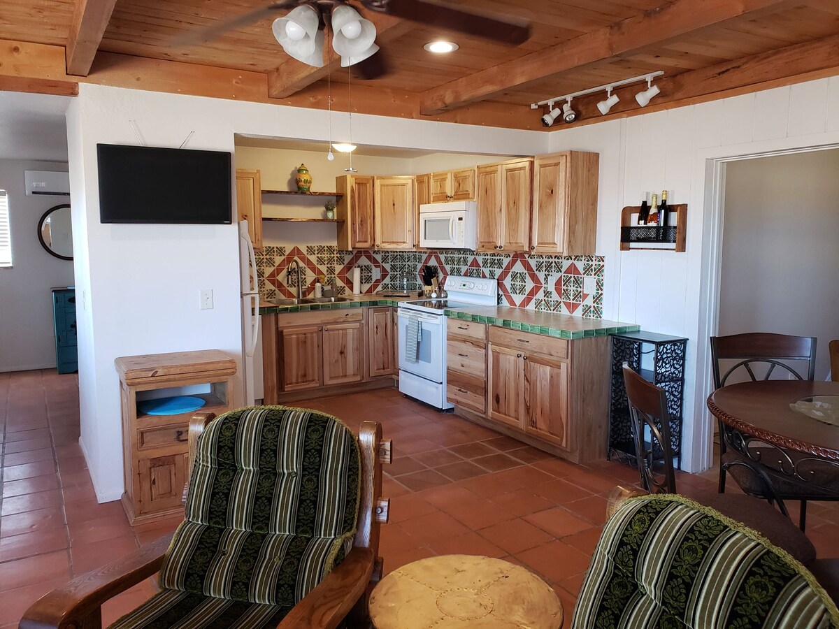 Una casa de huéspedes, enclavada en una arboleda de mezquites, ubicada a solo una manzana de las tiendas locales del centro de la ciudad, espera tu llegada. Una cocina completa, equipada con las comodidades básicas, dormitorio con cama tamaño queen y sofá cama doble, y baño con ducha, hacen de este espacio un lugar perfecto para una pareja o una familia pequeña. La sala de estar delantera tiene un sofá futón y TV inteligente.