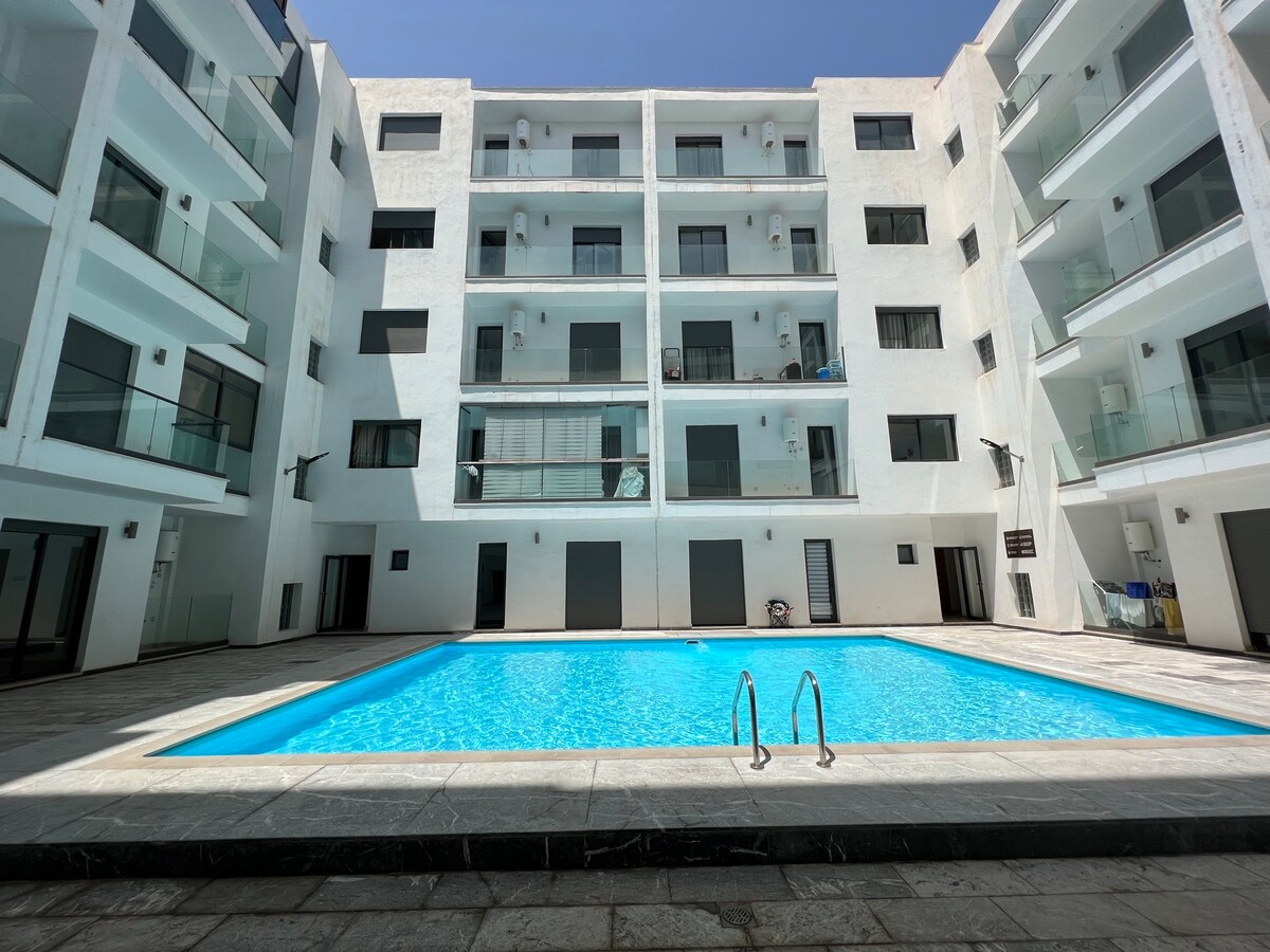 Apartamento moderno en el corazón del centro turístico de Agadir con piscina y jardín situado a 10 minutos (a pie) de la playa y a 400 metros del supermercado/Pizza Hut. En el barrio están las mejores cafeterías y restaurantes. ¡Muy buen equipamiento!