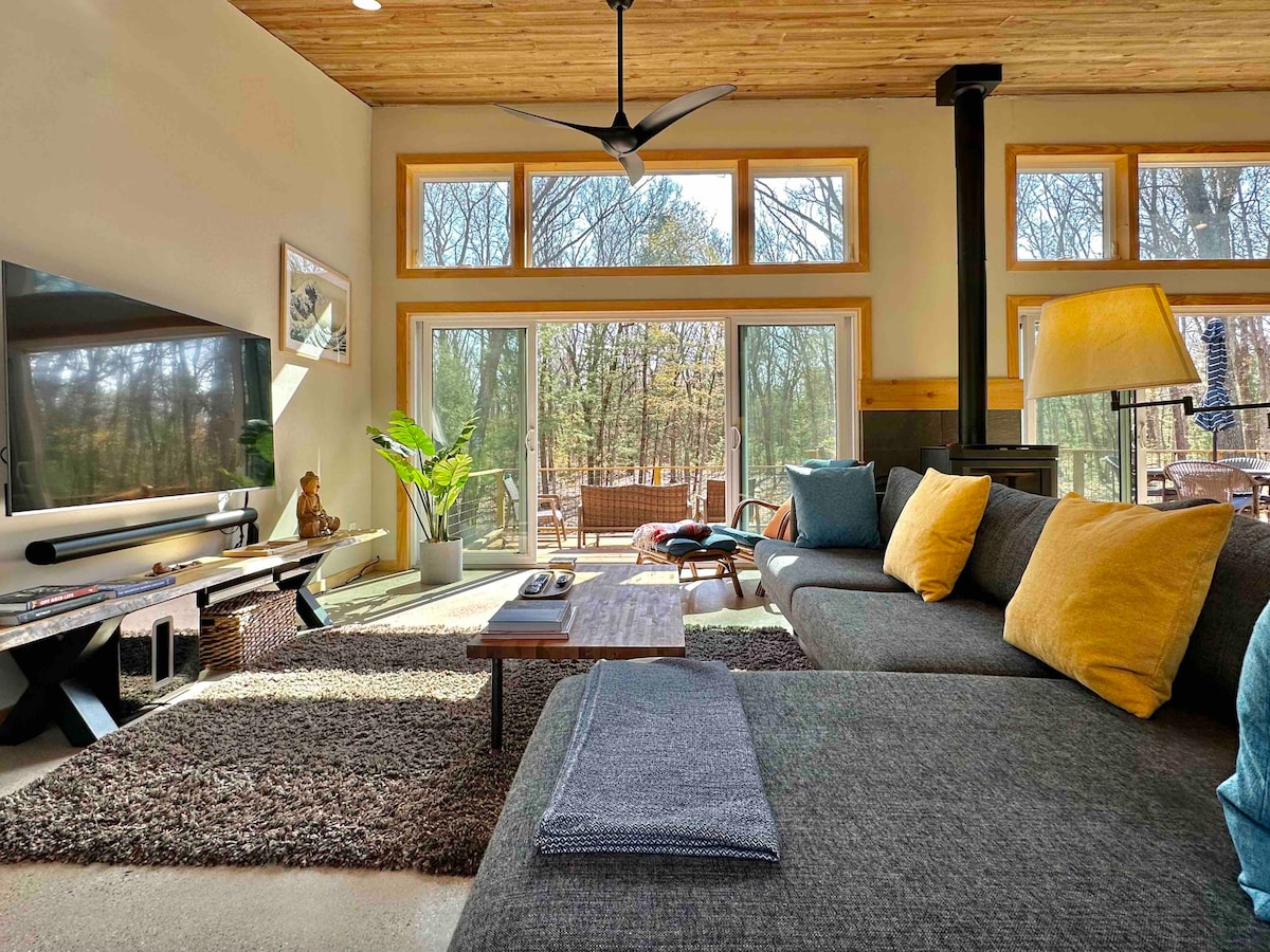 Escápate a esta moderna cabaña en el bosque. Relájate en la privacidad y disfruta de la paz y tranquilidad con majestuosas vistas de imponentes árboles. La luz solar natural inunda el hogar creando un ambiente saludable para relajarse. Mantente cómodo con suelos de hormigón con calefacción y una chimenea de gas. Cocina en la cocina bien surtida. Olvídate de tus preocupaciones en el jacuzzi privado. Asa s'mores en el fogón del patio trasero. Parrilla en la enorme terraza. Sala de juegos de 3 estaciones en el granero SIN CALEFACCIÓN. Se admiten perros con espacio en el patio trasero para que estén sin correa.