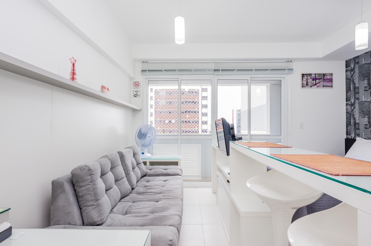 Sofisticado apartamento tipo estudio ubicado a 800 metros del parque Vila Germânica, lugar de eventos como el Oktoberfest. Rodeado de restaurantes, bares y supermercados. Todo para su comodidad: Smart TV 50" Samsung, aire acondicionado split, ducha de gas, wifi fibra 240mb, cocina completa con heladera Brastemp, microondas, horno, estufa, campana extractora, cafetera, purificador de agua, lava y seca, armarios, y por supuesto ¡una cama queen con el mejor colchón!