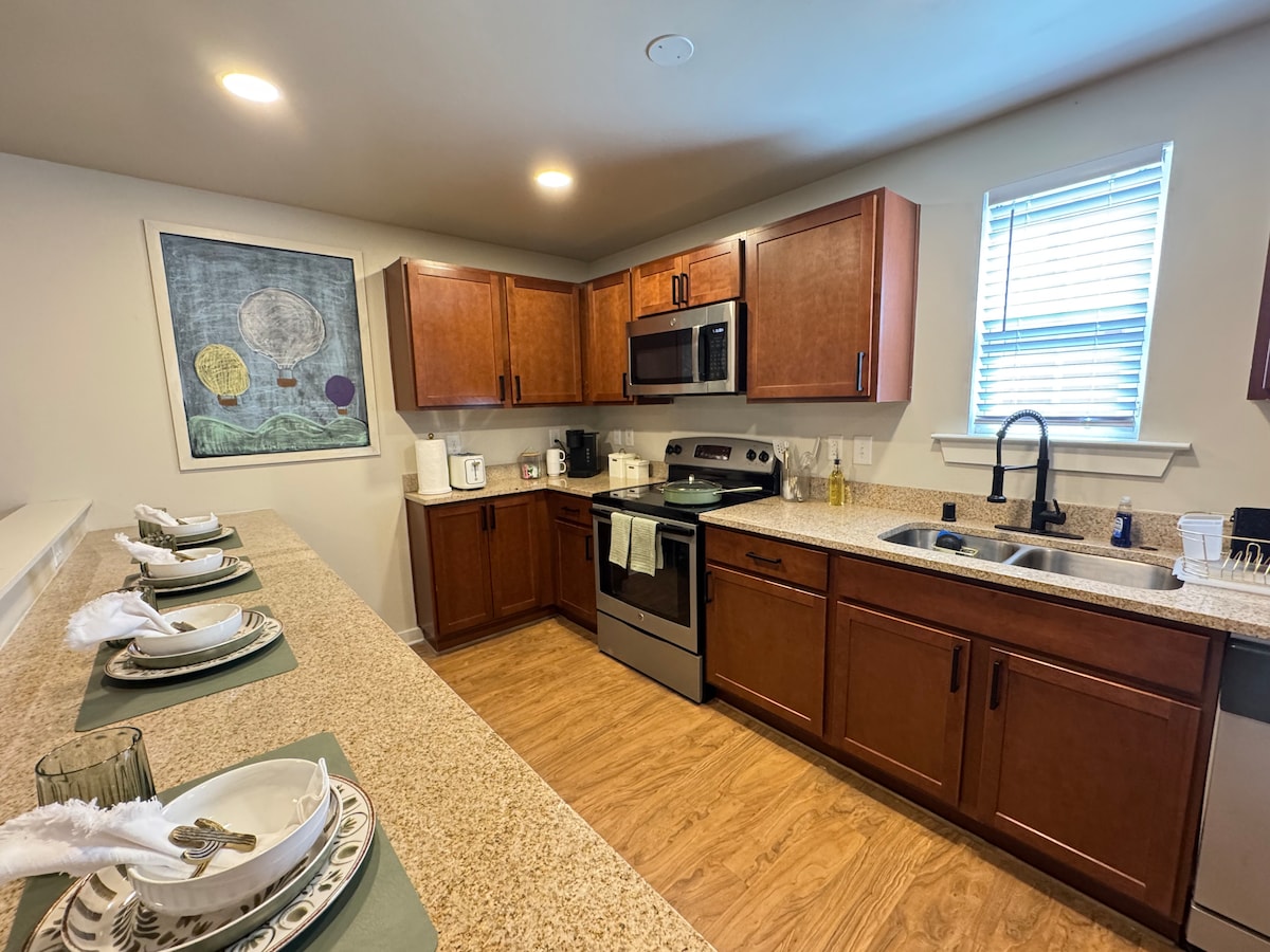 Bienvenido a The Townhome @Sunport, una joya oculta. Una tranquila comunidad cerrada de casas construidas en 2014, que ofrece una espaciosa casa adosada de 2 plantas y 5 dormitorios y 5 baños en la zona de Sunport de Albuquerque. A solo 2,7 millas de UNM y Nob Hill. Disfruta de una buena gastronomía, arte y excelentes lugares nocturnos. Cerca de los terrenos de la Fiesta Internacional del Globo, casinos, parque de pelotas, acuario ABQ y jardín botánico. Nuestra propiedad tiene muchas comodidades, lo que hace que este alquiler sea perfecto para familias y amigos que buscan aventura y relajación.