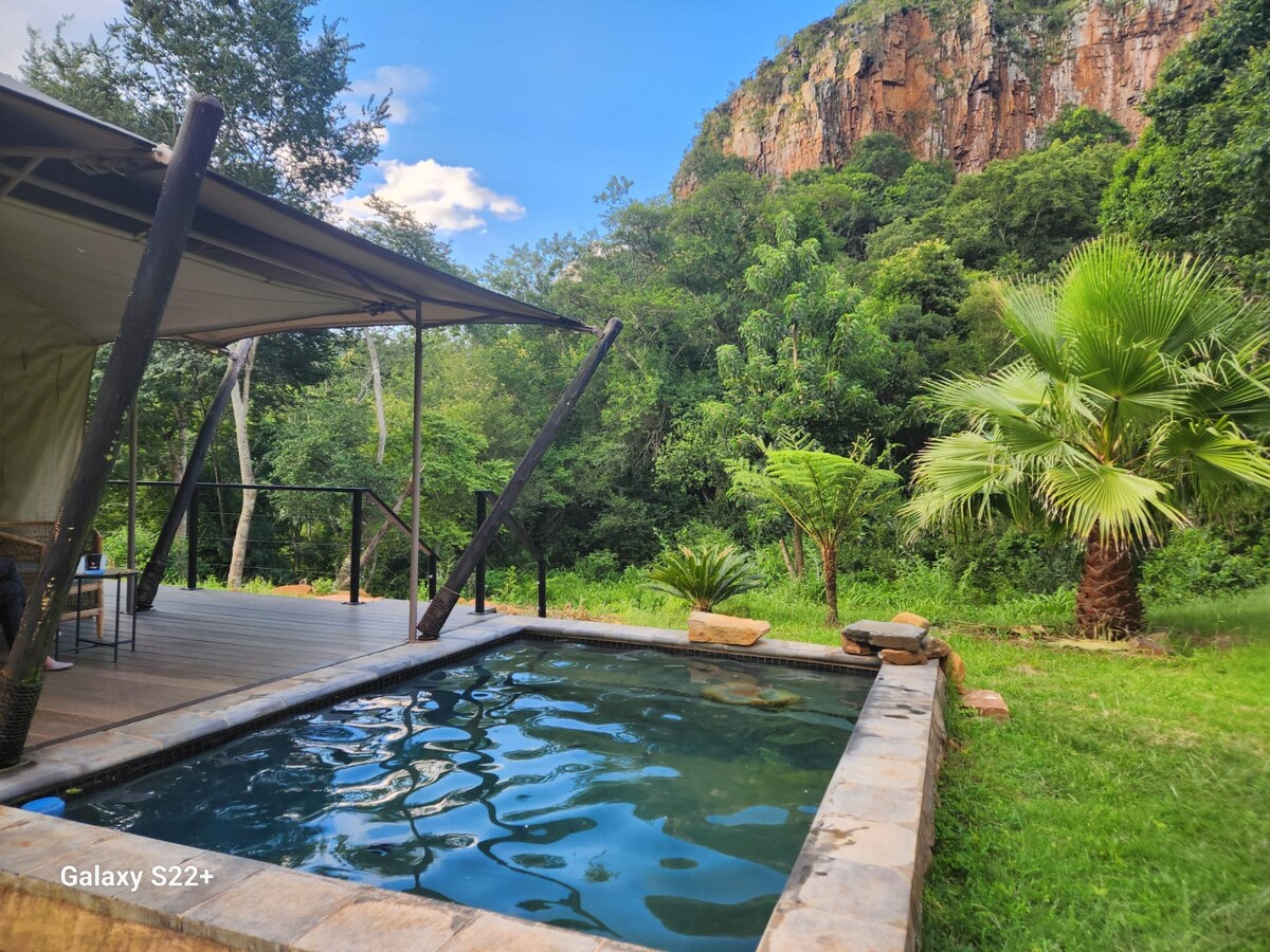 Tienda de campaña de lujo de 2 camas con piscina: nuestra tienda de campaña de Aquila tiene una ubicación única en una altitud natural en la escarpa, que ofrece magníficas vistas a los acantilados circundantes, el estanque cristalino en el arroyo de montaña y el valle boscoso. La piscina de inmersión junto a la cubierta se desborda con agua de tierra natural y prístina que fluye desde una fuente en el suelo alto y es aireada por la cascada mientras fluye por el barranco.