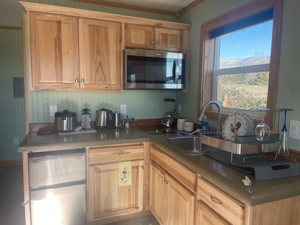 La Carriage House se encuentra en Kelly's Farm, a cuatro millas de la ciudad de Ashland y a menos de dos minutos de la autopista 5. Esta casa de dos pisos tiene 440 pies cuadrados con dos puertas corredizas de vidrio que ofrecen una vista de 360 grados de las montañas y la puesta de sol. Hay una terraza arriba y abajo, una parrilla de propano y la cocina está totalmente amueblada, dos quemadores, horno de encimera y arrocera, entre otras cosas. Preparada para tres personas usando dos camas. Los perros son bienvenidos, pero no aceptamos gatos.