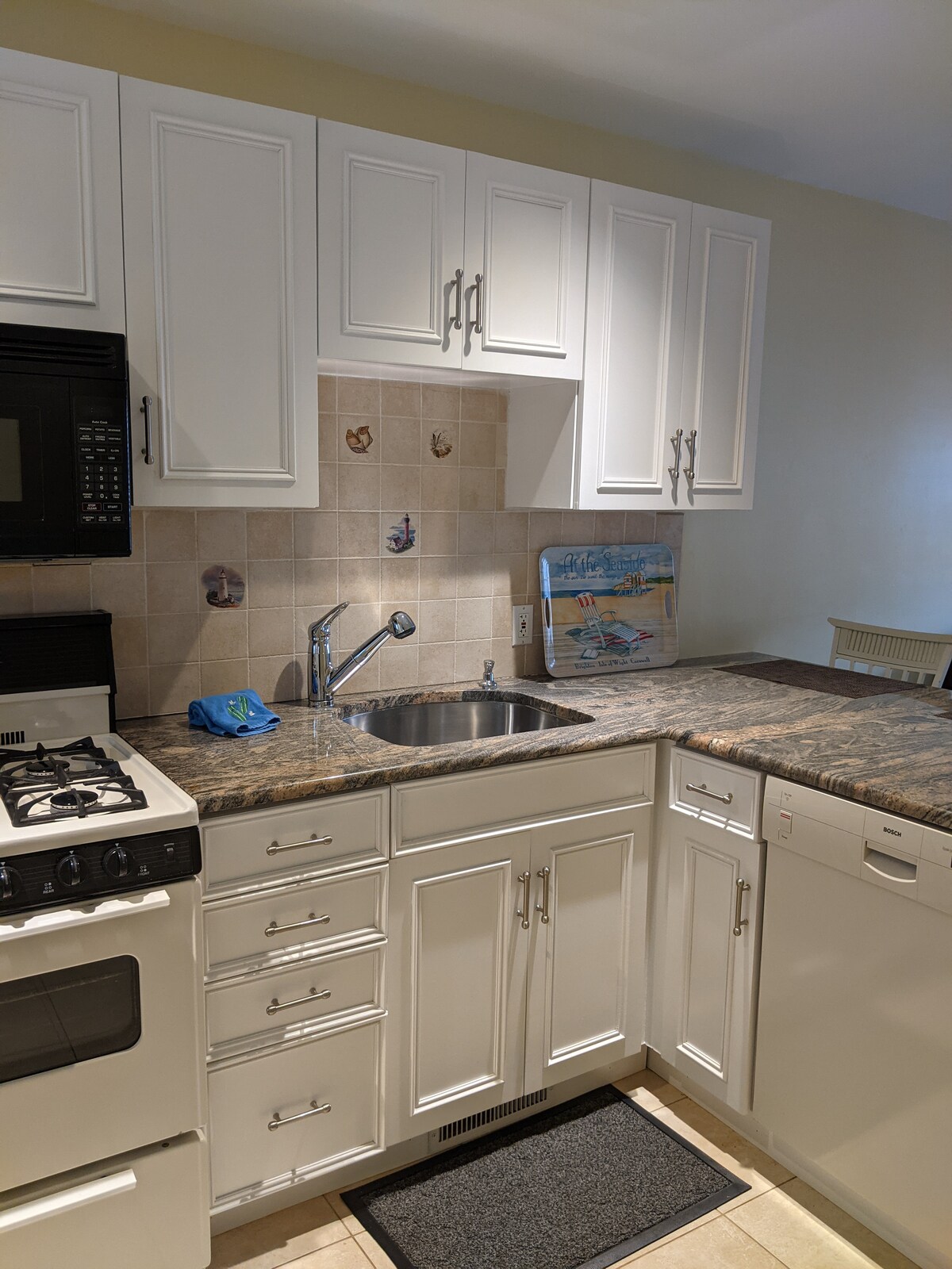 Recién renovado, este soleado apartamento de 2 dormitorios y 2 baños cuenta con acogedora chimenea de leña, aire central, increíbles vistas al mar con patio, tenis, piscina, estacionamiento, barbacoa y lanzamiento de playa para deportes acuáticos. La cocina está equipada con todas las necesidades de cocina y repostería. Refrigerador de vino, Kuerig, prensa francesa. Incluye TV con pantalla ancha, Sonos, WIFI de 1 gig, impresora HP todo en uno. Tranquilo barrio arbolado a 2 manzanas de todo lo que ofrece Greenport. ¡Incluye muelle para barcos!