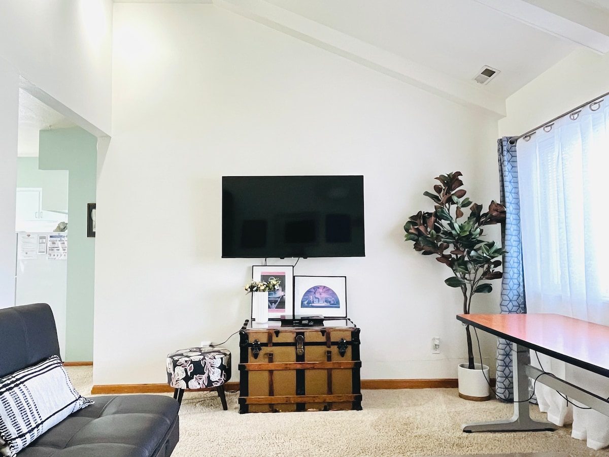 ¡Explora Eugene desde un moderno y cómodo apartamento estudio justo en Riverbank Path! Acceso inmediato a más de 12 millas de senderos pintorescos y pavimentados a lo largo del río Willamette, con parques y zonas naturales tranquilas, ¡todo a solo 3,5 millas del estadio Autzen/U de O y del centro de Eugene! Cama cómoda, cocina completa, televisión por streaming gratuita, zona para trabajar y lavandería compartida. Entrada privada, llegada sin contacto y cómodo aparcamiento fuera de la calle. ¡Un refugio tranquilo!