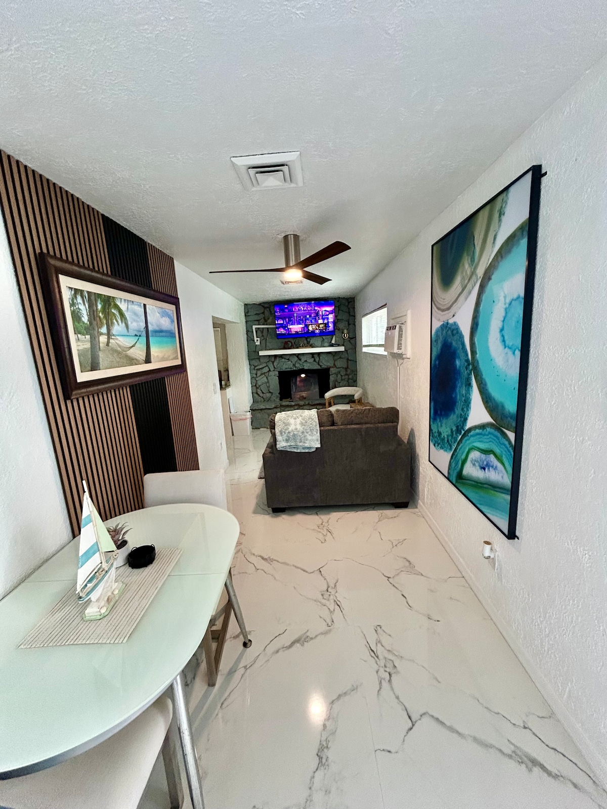 ¡Bienvenido a nuestra acogedora eficiencia en South Hutchinson Island, Florida! Nuestro dormitorio es perfecto para solteros o parejas, con una cama tamaño queen Murphy y entrada privada en la planta baja. Una placa de inducción, horno de convección, nevera de tamaño completo, Smart TV y un baño completo. Ubicado en un barrio agradable, estamos cerca de playas, embarcaderos, restaurantes y el centro histórico. ¡Ven a alojarte con nosotros y disfruta de todo lo que ofrece la Costa del Tesoro!