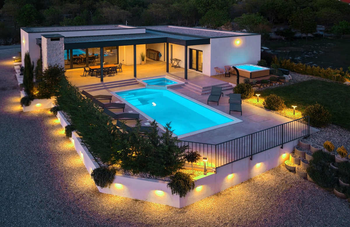 Bienvenido a tu oasis privado entre las montañas y el mar, a solo 300 metros de la playa y a unos pasos de la belleza salvaje de Velebit y el Parque Nacional de Paklenica. Nuestra villa ofrece el equilibrio perfecto entre naturaleza, comodidad y bienestar, con una piscina climatizada de agua salada, hidromasaje al aire libre y una sauna privada para relajarse después de un día de aventura. En el interior, encontrarás 3 dormitorios con baño y una acogedora sala de bienestar con una cama supletoria, ideal para familias, parejas o trabajadores remotos que busquen tranquilidad y espacio.