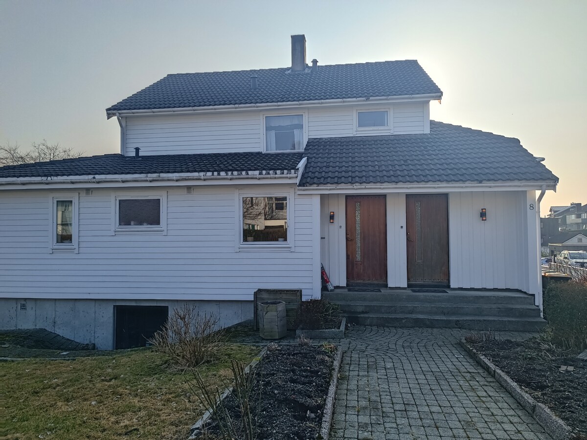 Duerme bien en camas cómodas en nuestra casa ubicada en un barrio silencioso. Tienes tu propio baño. Desde tu sala tienes una vista espléndida. Hay aparcamiento gratuito fuera de nuestra casa. Eres libre de acompañarnos en nuestra terraza (si el sol brilla...). Normalmente te servimos un buen desayuno todos los días con rollos noruegos caseros frescos. La tienda de comestibles/lago Mosvatnet más cercana está a 5 minutos a pie. También cerca de la universidad de Stavanger y del Hospital Universitario Stavanger.