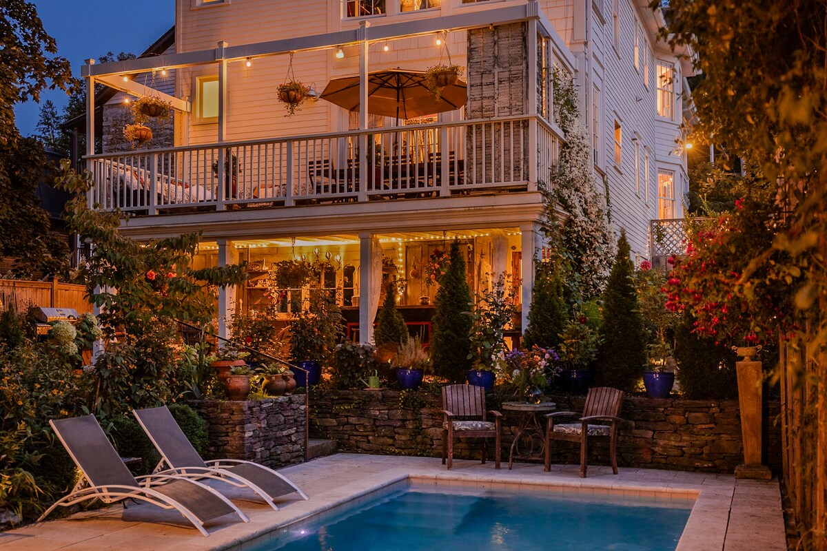 ¡Te damos la bienvenida a Palazzo Hudson! ¡La única casa de vacaciones privada en Hudson con sauna de lujo, bañera de hidromasaje de cedro, piscina cubierta de temporada, cocina de chef y salón junto a la piscina con chimenea y biblioteca de arte! Un hogar para todas las estaciones, experimentarás inspiración y relajación desde las habitaciones cálidas y llenas de luz, arte, libros, música, características de spa de lujo y terraza al aire libre, patios y jardines. A pocos pasos de los restaurantes, bares, cafeterías y tiendas de Warren Street y del distrito de Upper Depot.