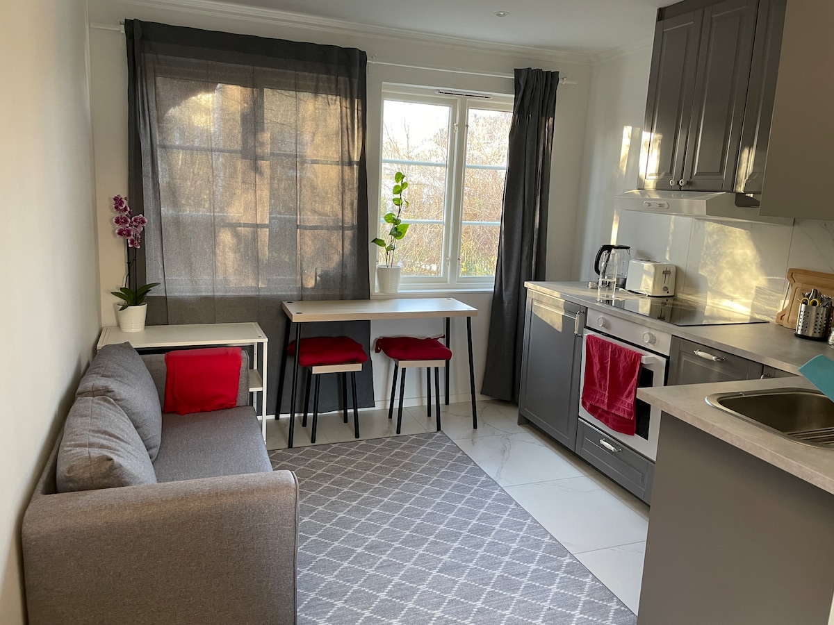 Precioso apartamento tipo estudio totalmente amueblado en una villa en una zona tranquila. El estudio está a solo 20 minutos del centro de la ciudad. El estudio ofrece alojamiento para una pareja o una persona soltera con balcón con vistas al jardín, 1 dormitorio (cama de 140 x 200 cm), una sala de estar y una cocina bien equipada con lavavajillas y nevera. El sofá cama de la cocina y el salón se puede convertir en un colchón a nivel del suelo. La cocina totalmente equipada tiene estufa de inducción, horno, mininevera, hervidor de agua y tostadora.