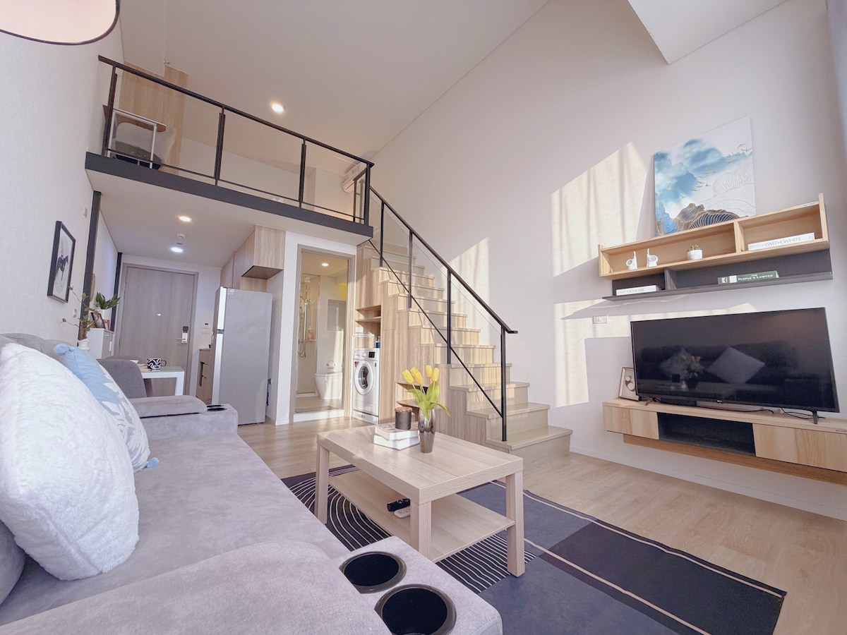 <M10> ¡Nuevo! ¡Promoción! Apartamento dúplex con piscina en Soi 87, con sofá cama, internet de alta velocidad, bar en la azotea y cerca de la estación de BTS Onnut