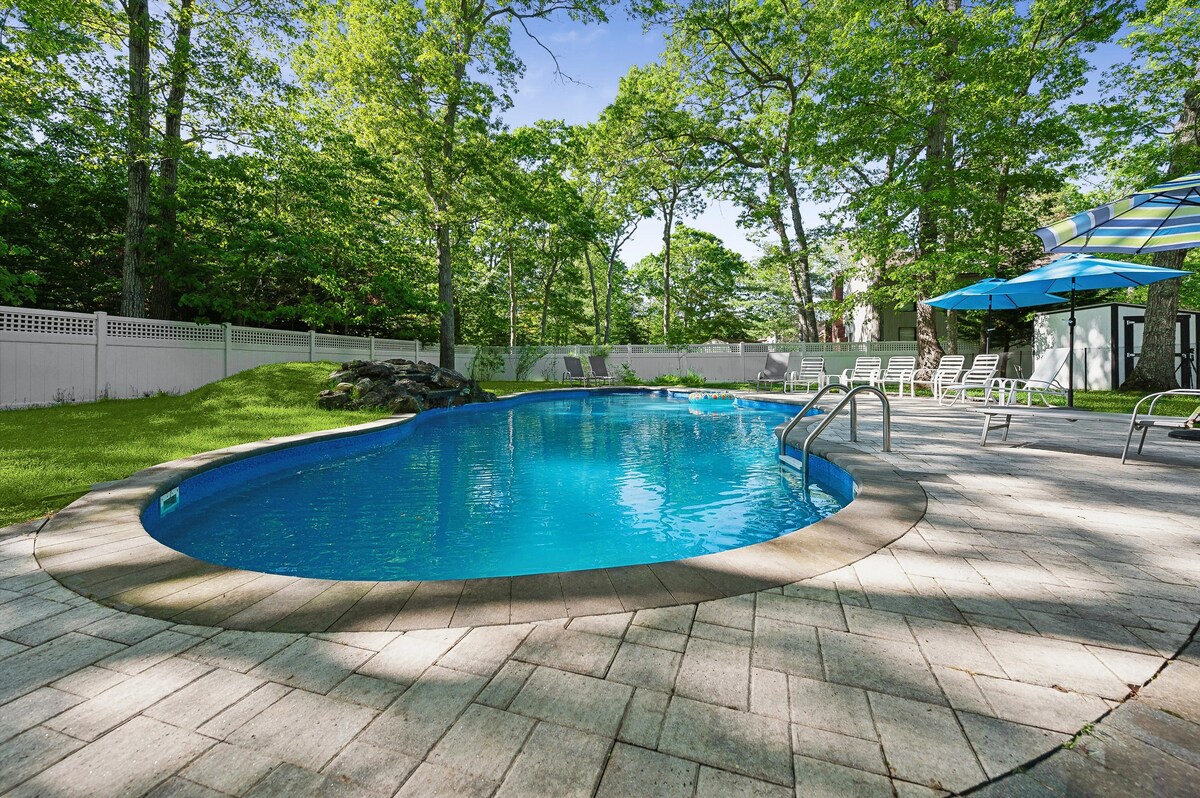 Icónico bungalow de playa y piscina de los años 70 enclavado en una parcela privada de 3/4 acres rodeada de robles maduros y árboles de hoja perenne. Nuestra casa está designada intencionalmente por diseñadores de interiores, llena de objetos de colección, arte y antigüedades. Disfruta del ambiente «Hamptons Bohemia», con una sala de estar abovedada, amplios asientos, una chimenea de leña y una zona al aire libre con una amplia terraza de cedro y una piscina climatizada. Situado a pocos pasos de las playas de la bahía y a 8 minutos en coche de la playa de Ponquogue y The Bowl Spot para surfear.