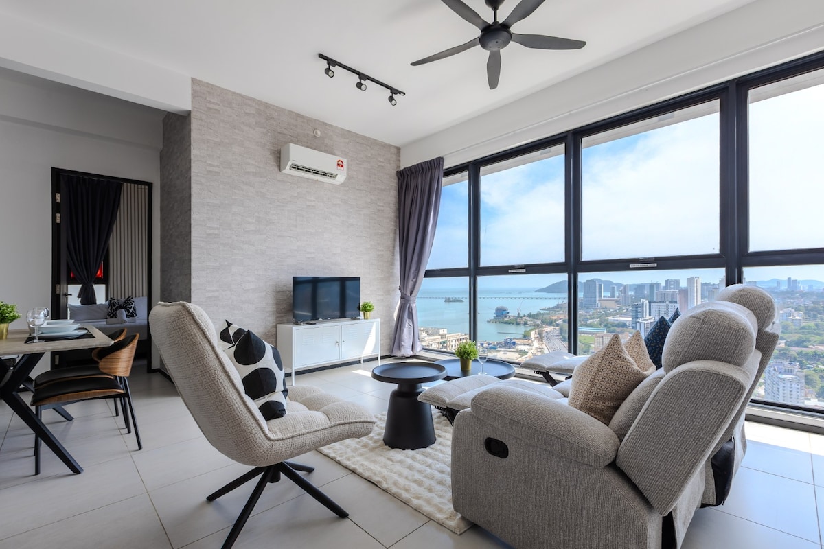 *La mejor UBICACIÓN en Penang, GURNEY DRIVE, el destino turístico n .º 1 *Un alojamiento DÚPLEX EN ESQUINA *Increíble piso alto con VISTAS AL MAR AL AMANECER * Diseño japonés con todas las comodidades *SMART TV * WIFI de 100 Mbps. *Disfruta de un impresionante amanecer desde los DORMITORIOS, el salón y el comedor *Rodeado de HOTELES, CENTROS COMERCIALES y variedad de restaurantes LOCALES * Aparcamiento interior gratuito para 1 coche *Las instalaciones incluyen piscina cubierta, gimnasio y Sky Lounge *Relajantes paseos FRENTE AL MAR
